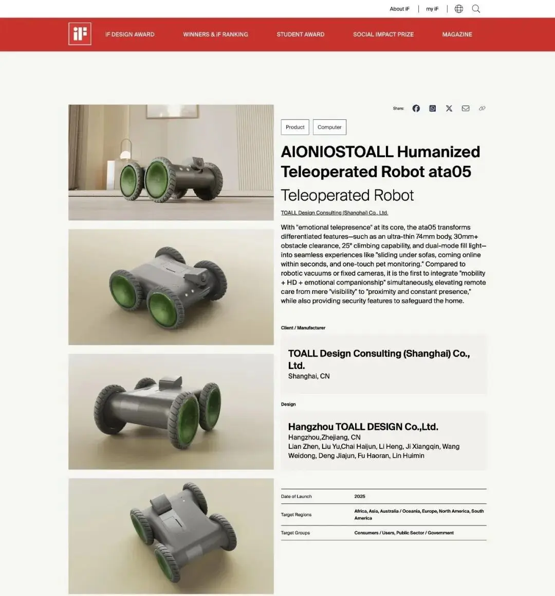 近日,2026年德国iF Design Award获奖名单正式揭晓,TOALL凸凹设计自主研发设计的ata05阿它五号远程替身机器人与AIVELA Ring Pro智能戒指双双荣获这项国际顶尖设计大奖。更令人瞩目的是,这两款作品不仅是评审团眼中的设计佳作,更已在全球最大的创意产品众筹平台Kickstarter上获得消费者的真金白银支持,实现了专业认可与市场口碑的双重印证。