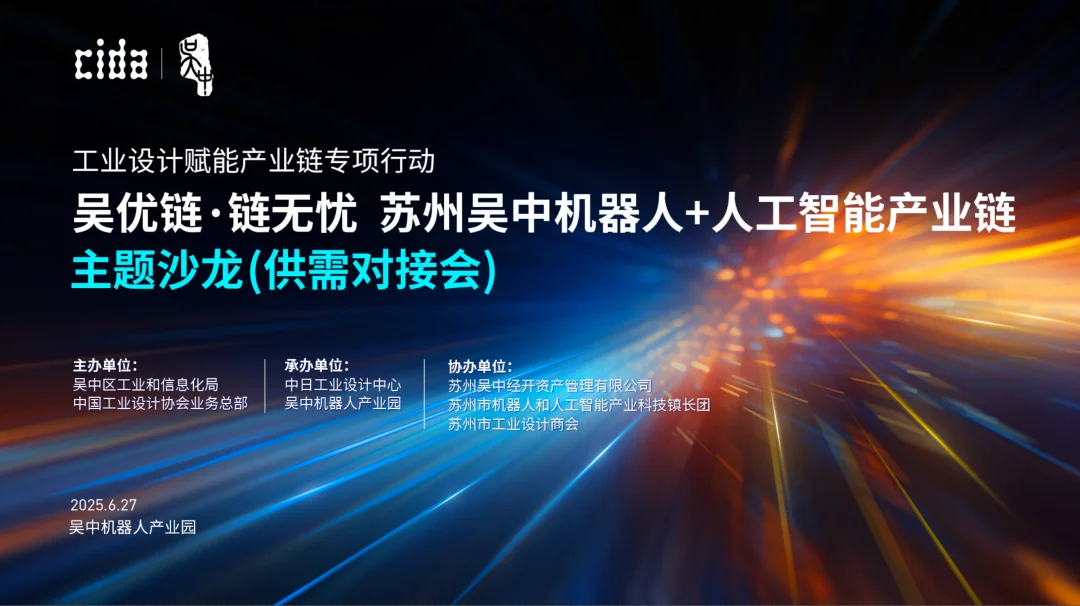 2025 年 6 月 27 日,由 CIDA 中国工业设计协会主办的“工业设计赋能产业链专项行动——吴优链·链无忧 苏州吴中机器人+人工智能产业链主题沙龙(供需对接会)”在苏州盛大举行。