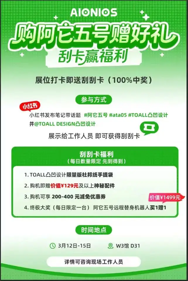荣获德国iF设计大奖、日本G-Mark奖、三项美国MUSE设计金奖、台湾金点奖等国际顶尖荣誉的ata05阿它五号远程替身机器人,将首次在国内线下展会与公众见面。这款全球首款家居全地形适应机器人,如何实现“释放关心的情绪”?来现场亲自操控体验,感受跨越空间的“真实在场”。